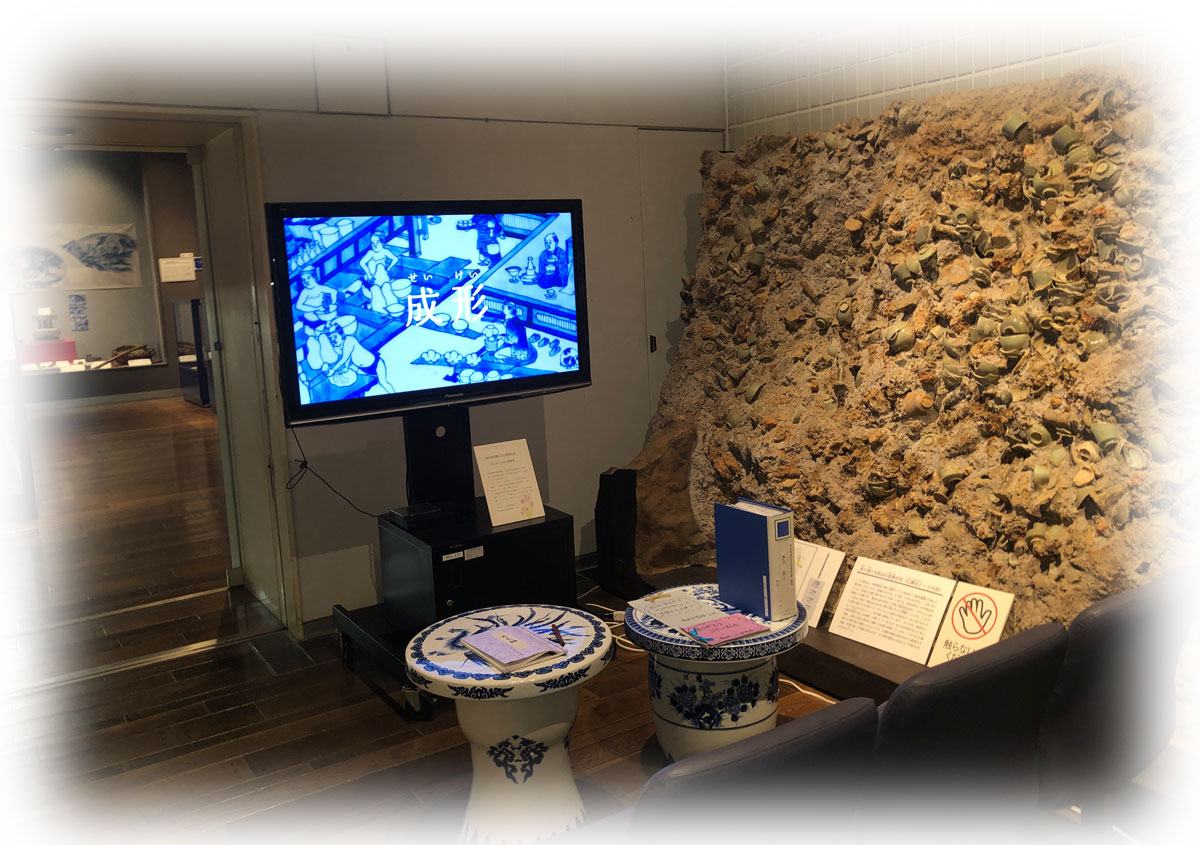 こちらが当時の海外輸出の時のコーナーになります。そもそもこの部屋は何の部屋なのかの説明が遅くなりました。この部屋、有田焼参考館という名称で、有田町内で確認された66カ所の窯跡と8カ所の遺跡から出土された陶片を、体系的年代別に並べて展示している部屋になります。このコーナー、主に海外輸出向けのコーナーになります。ここでのポイントだけを挙げていきたいと思います。先ほどデザイン的に、中国を模倣したというお話をしましたけれど、ここで変換できます。