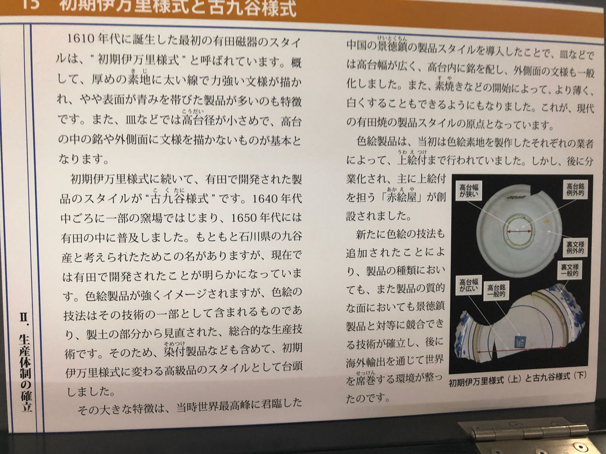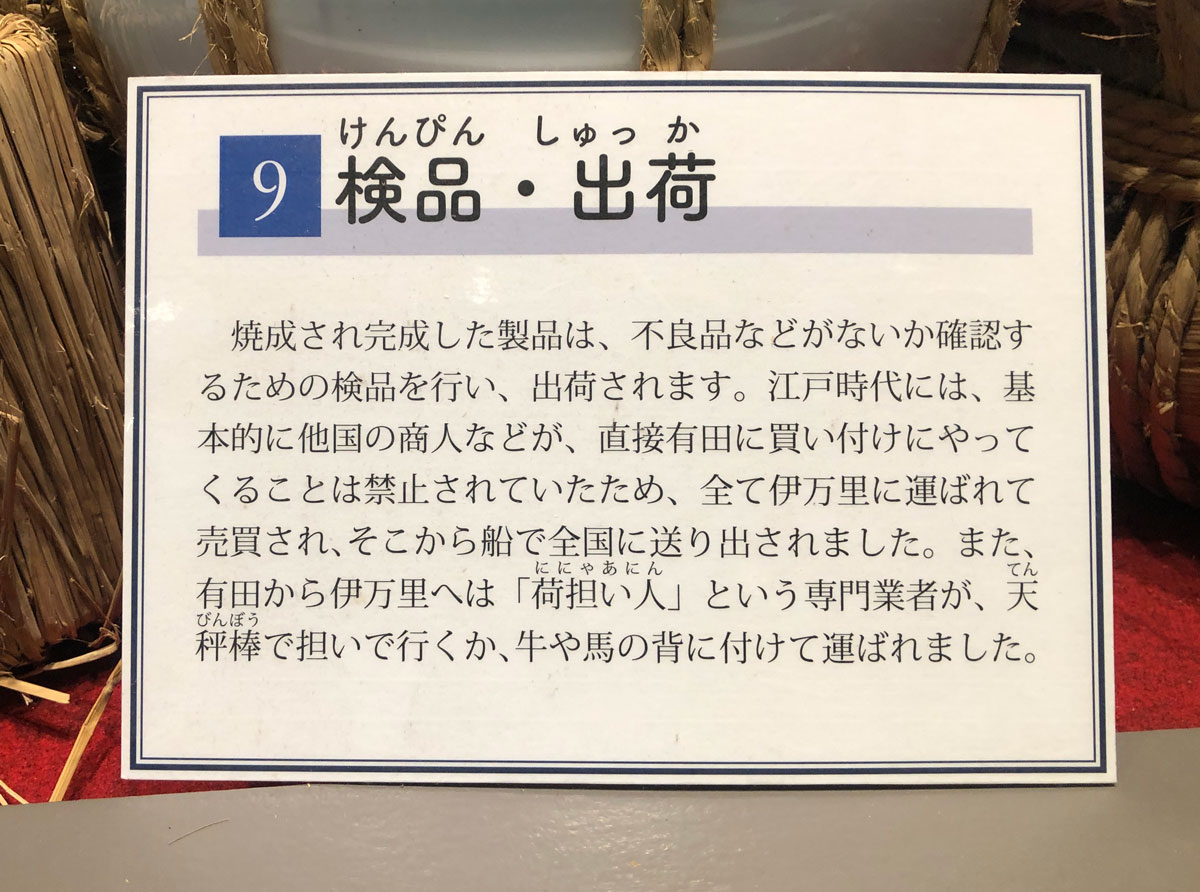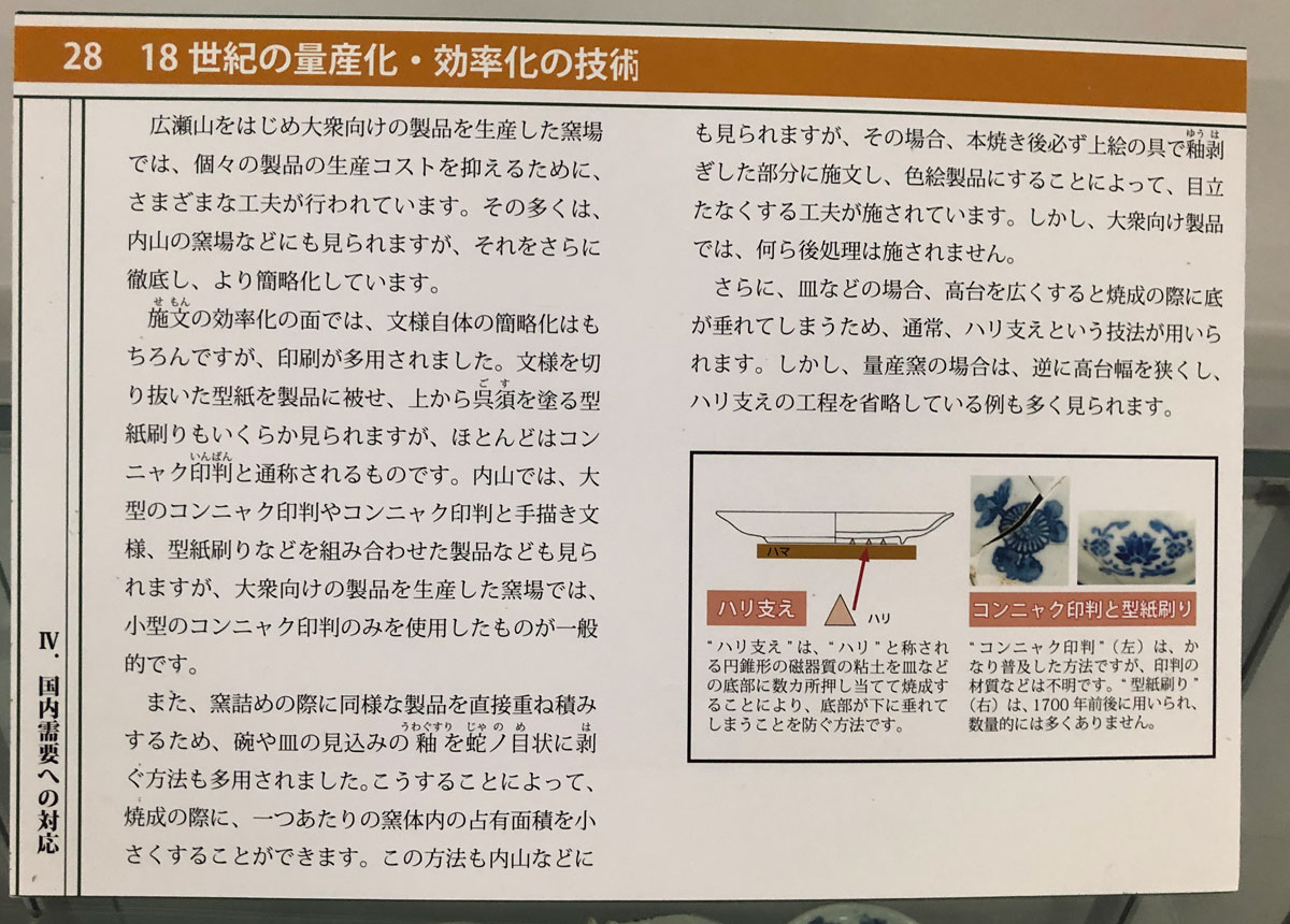 その意味では、さきほど見てきた陶磁美術館や九州陶磁文化館とも一線を画するわけですね。美術館や九陶が、完成した美術品としての焼き物を展示する施設であるのに対し、こちらの資料館は、それらの焼き物ができるまでだとか、製作する制度の裏側であるとか、焼き物の背景に関するものを展示している「博物館」ということで、主旨が大幅に異なる次第です。ただ九陶の常設展示のうち、最初の相当数に「有田町教育委員会提供」と書かれているものがあり、展示品一部の補完的な役割を担ってもいるわけです。