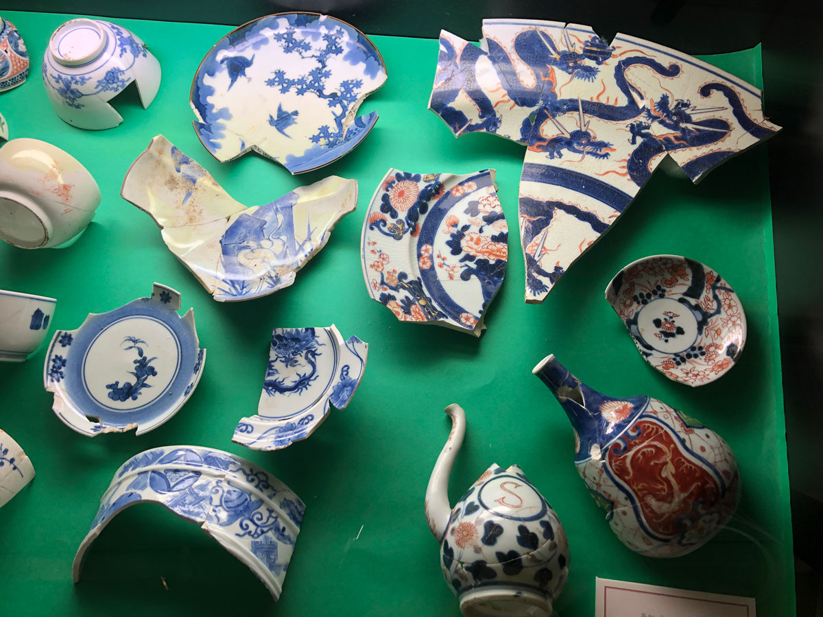 有田焼の海外輸出と言えば、金襴手に代表される派手なデザインをイメージしがちですが、最初に出たのは、カンボジア行きの粗質の磁器でした。この辺りが東南アジアに向けて送られた粗質の磁器、いわゆるそれほど上質じゃない種類のものです。一部の陶片からは、鳳凰のような絵が見えますけど、もっと簡略化されたものだと、三本の線しか描かれてないものもあります。つまり、こういうことが言えるかと思います。基本的に有田の磁器は、皆、手描きです。で、手描きを低コスト化しようと思ったら、図案の簡略化という方向に向かわざるを得ない。そのような生産品の集まりです。