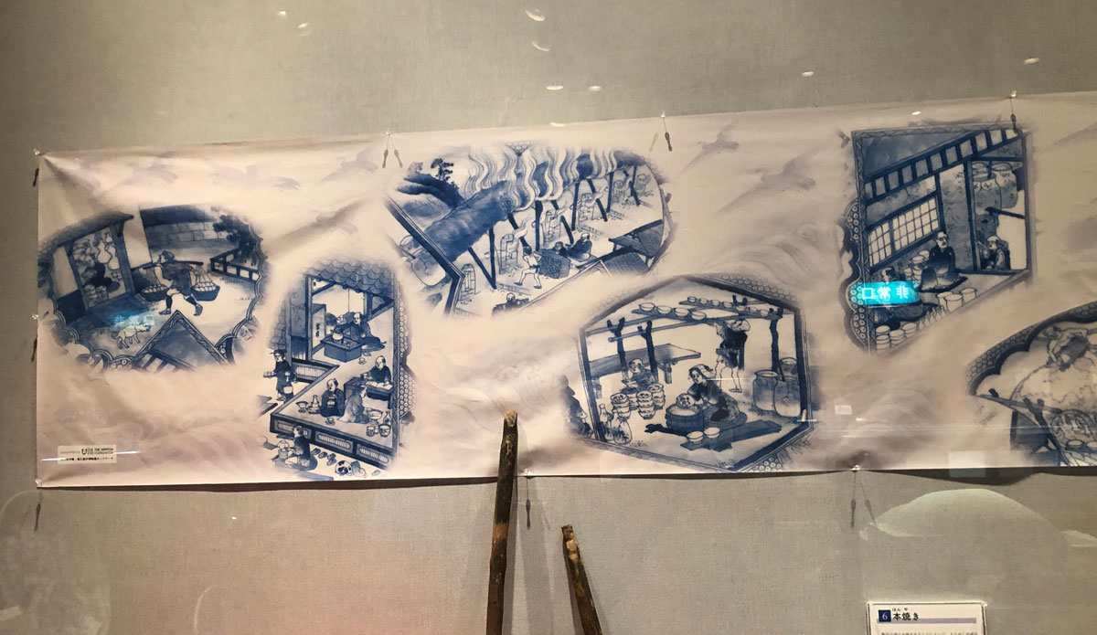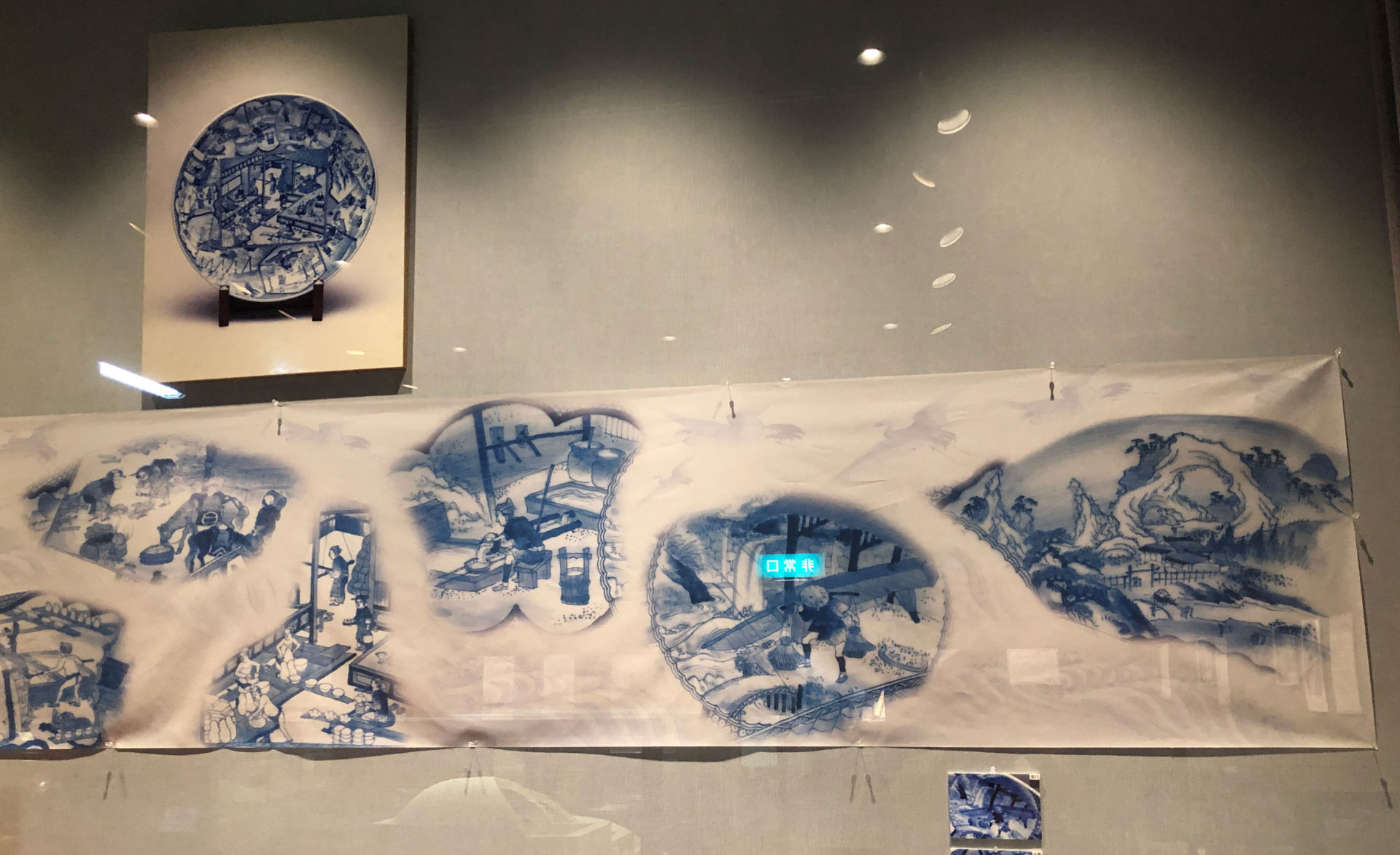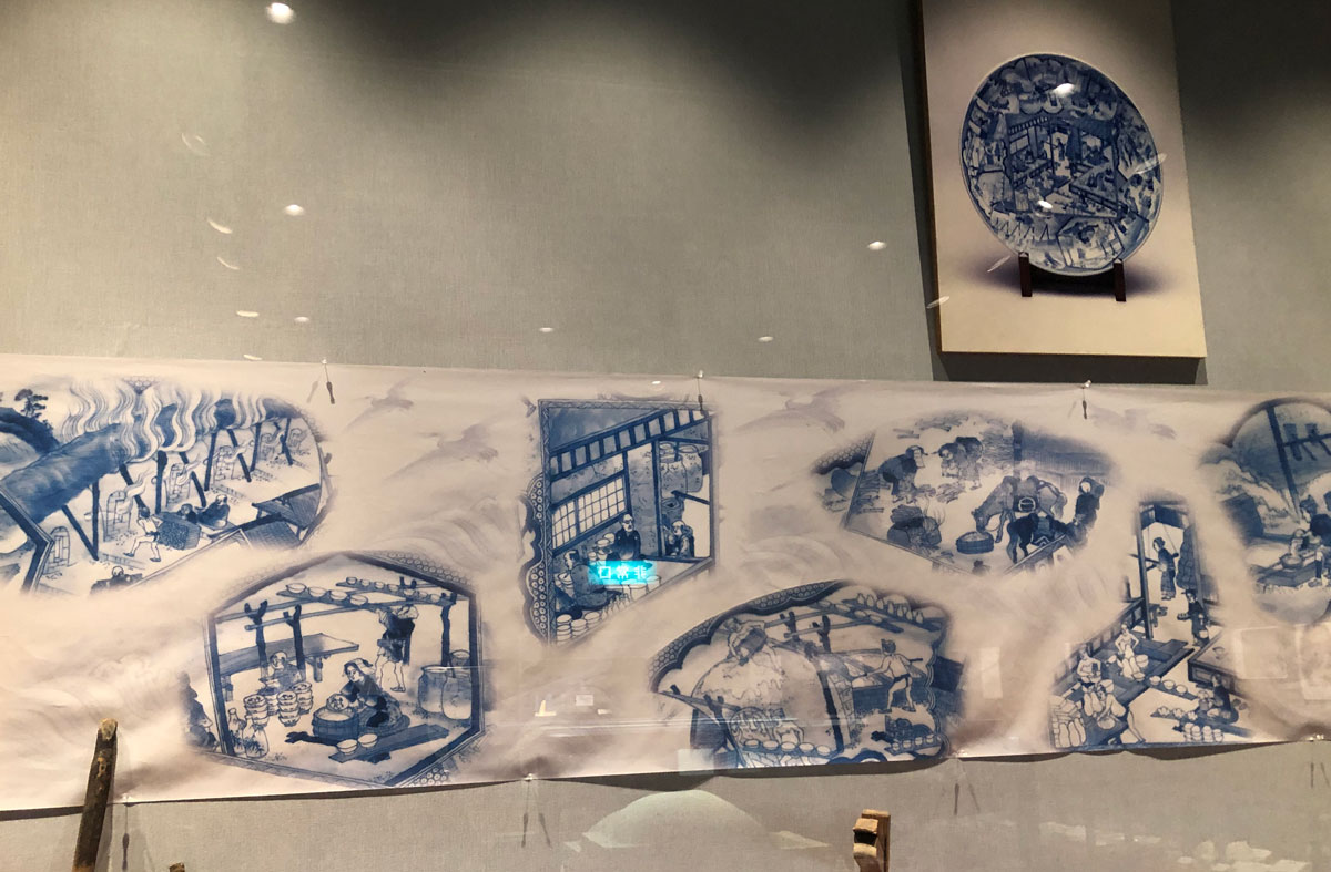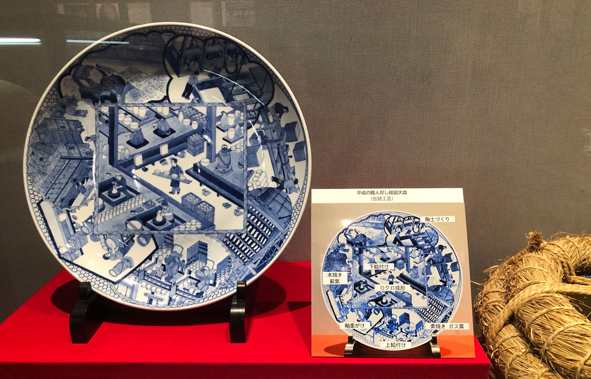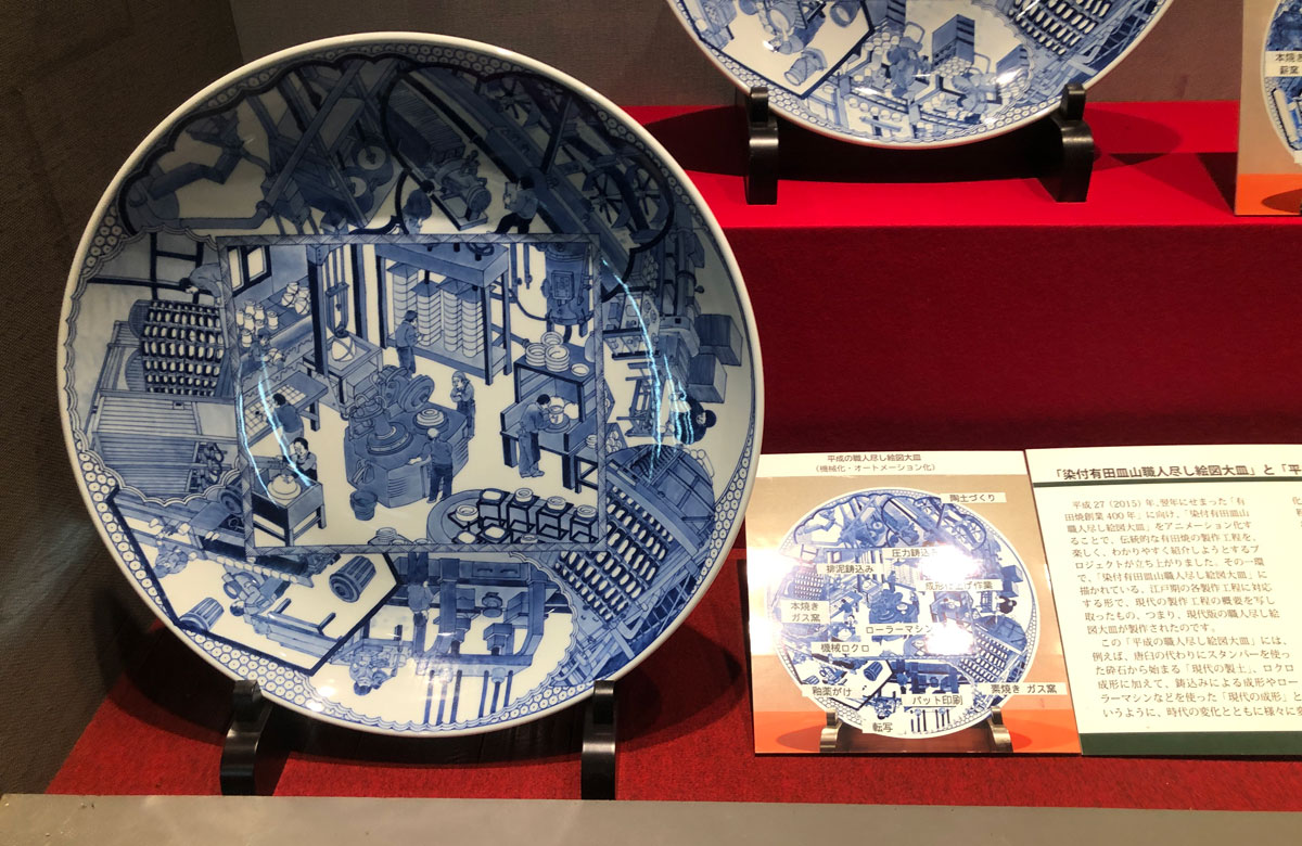 ただ平成を表現する場合、例えば今右衛門窯さんのように、伝統工程をそのまま残している窯と、一方には、完全に機械化が進んだ窯とがあります。そのために、伝統工芸版と機械化オートメーション版との両方を残しております。この職人尽くし絵図大皿でも、製作工程を描いたものを動画で10分・10分の割合で流しています。