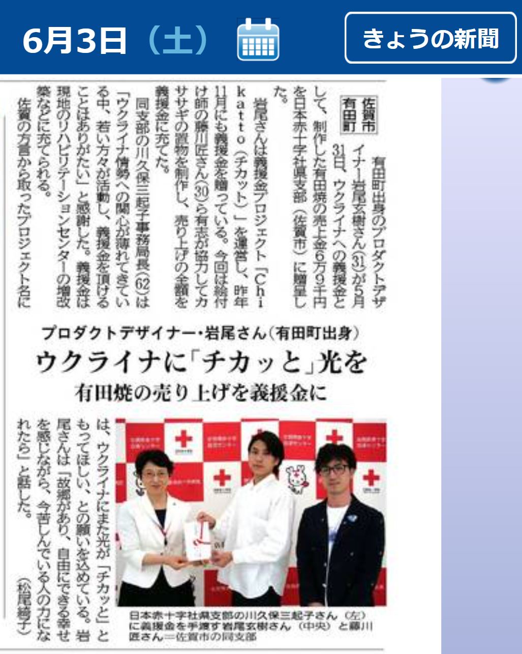 【カササギ、ウクライナに向けて】 新着情報 2023.06.03 こちらゆるり散歩堂に登場している絵付け作家の藤川匠さん。2023年6月3日の佐賀新聞で紹介されています。 ウクライナの戦火は、1年数カ月が経過し、ひょっとしたら私たちの頭の中でも、希薄化とか免疫化してるきらいはないでしょうか。 忘れてならないものを忘れないために、大上段でなくともいい、草の根的な、このような活動は貴いものだと思います。 平和への願いをこめ、カササギに思いを託して、ウクライナへ。届け、日本の西の端、そのまた隅っこの有田町から。 彼の創作による「チカット」はこちらです。