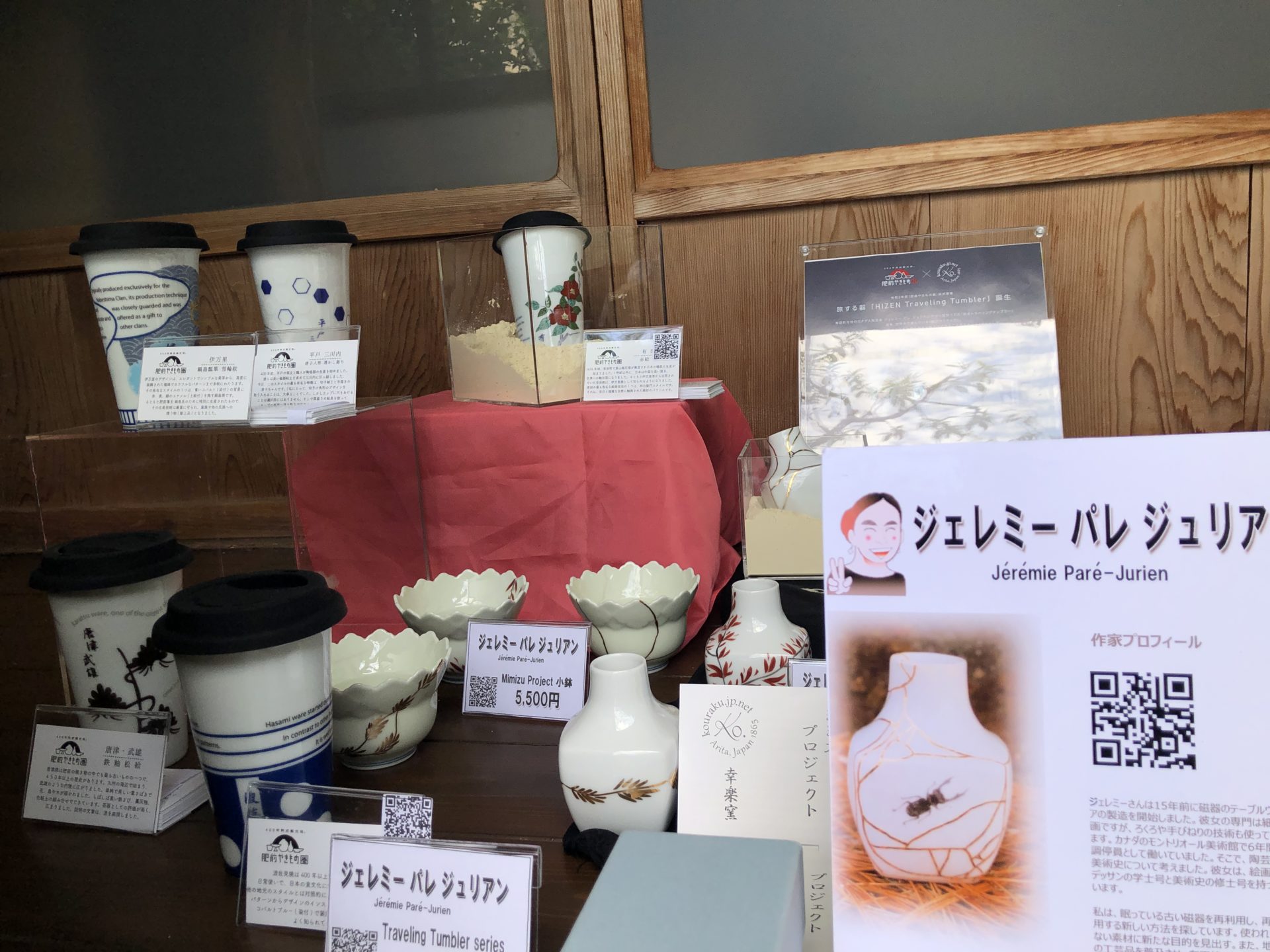 縁側展示も毎週、レイアウトを替えます。この週は、まず向かって左側にジェレミーさんのトラベリング・タンブラー、それとMimizuプロジェクトが並びます。