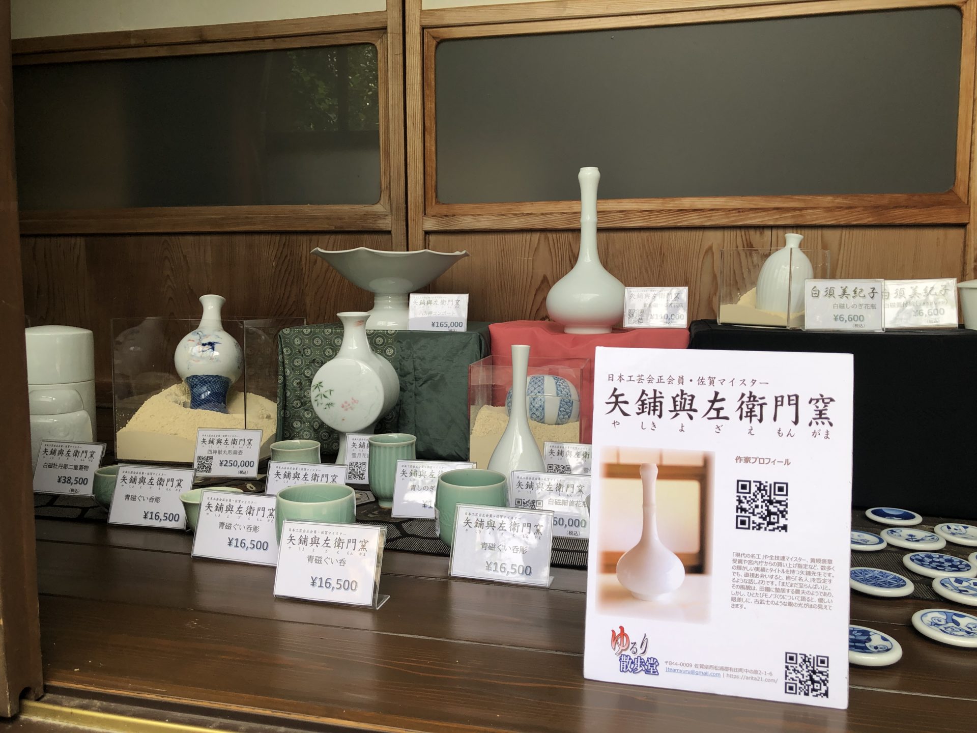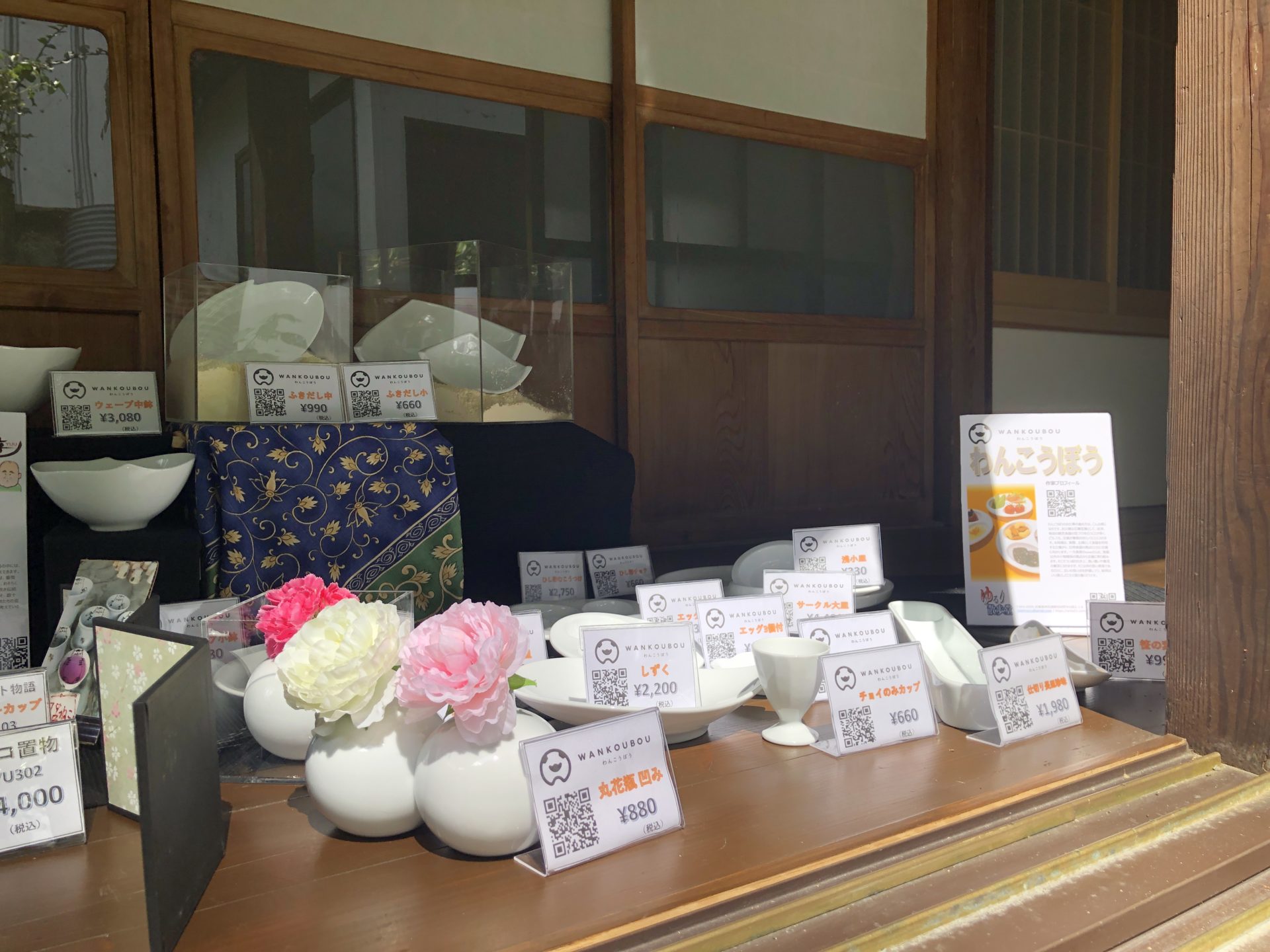 縁側南側の右端にわんこうぼうさんです。白磁のバラエティ豊かな品揃えが、見る者の目を楽しませてくれます。