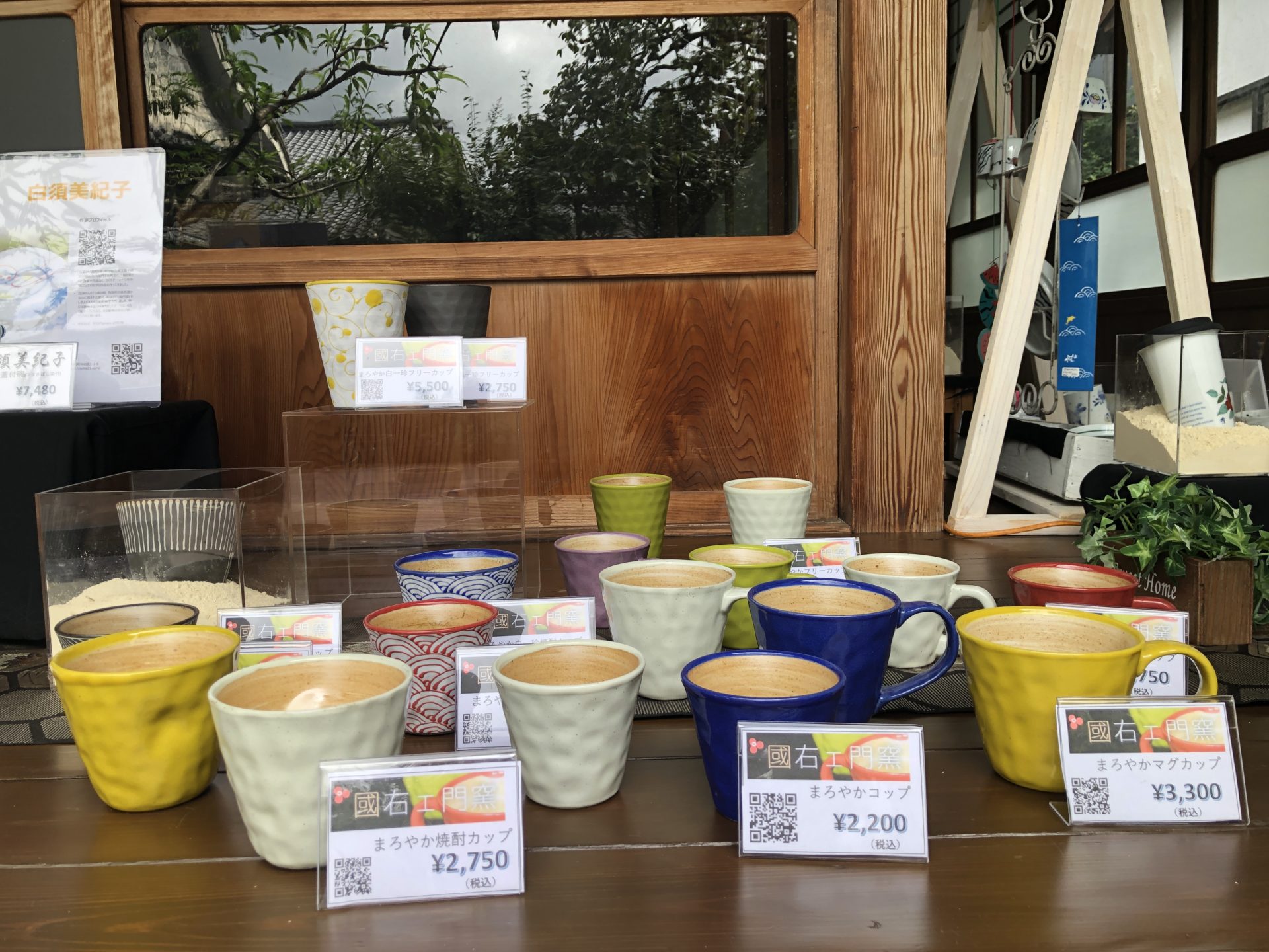 続いて國右ェ門窯さんです。色でなく形状に合わせて並べています。マグカップの大・小、(普通サイズの)カップ、フリーカップ、それと黒一珍、白一珍のシリーズがあります。