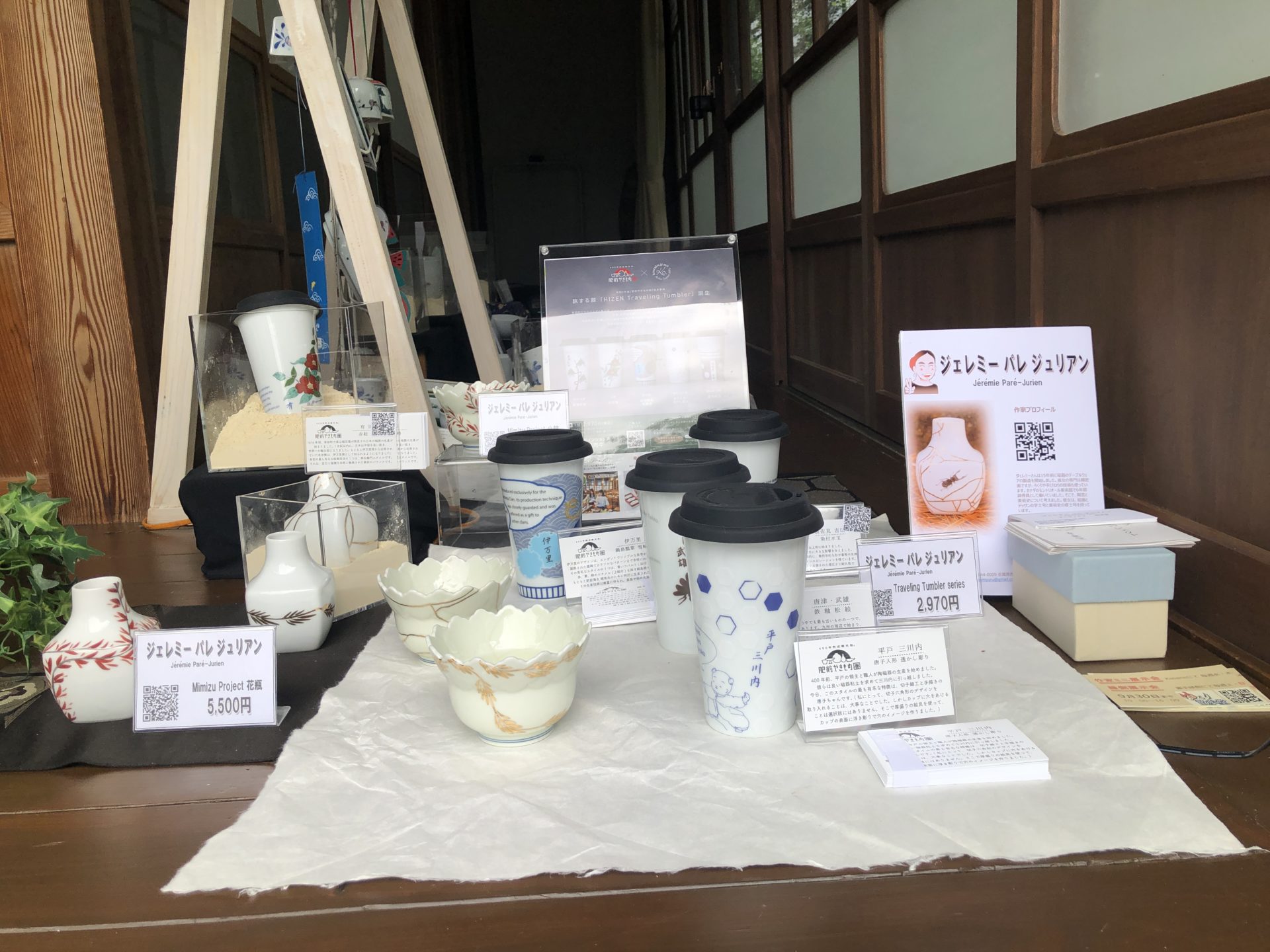 そして右端にジェレミーさんのコーナーです。トラベリング・タンブラー、それにMimizuプロジェクトのシリーズをディスプレイしています。