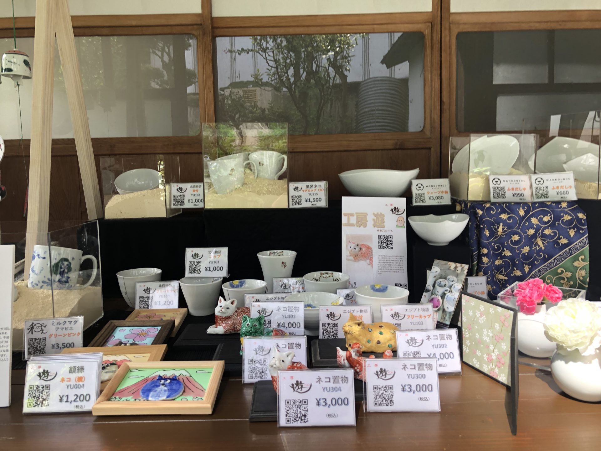 工房 遊さんのコーナーは南側中央です。風呂ネコシリーズ、北極物語シリーズ、エジプト物語シリーズの器とともに、猫置物、猫額縁が目をひきます。