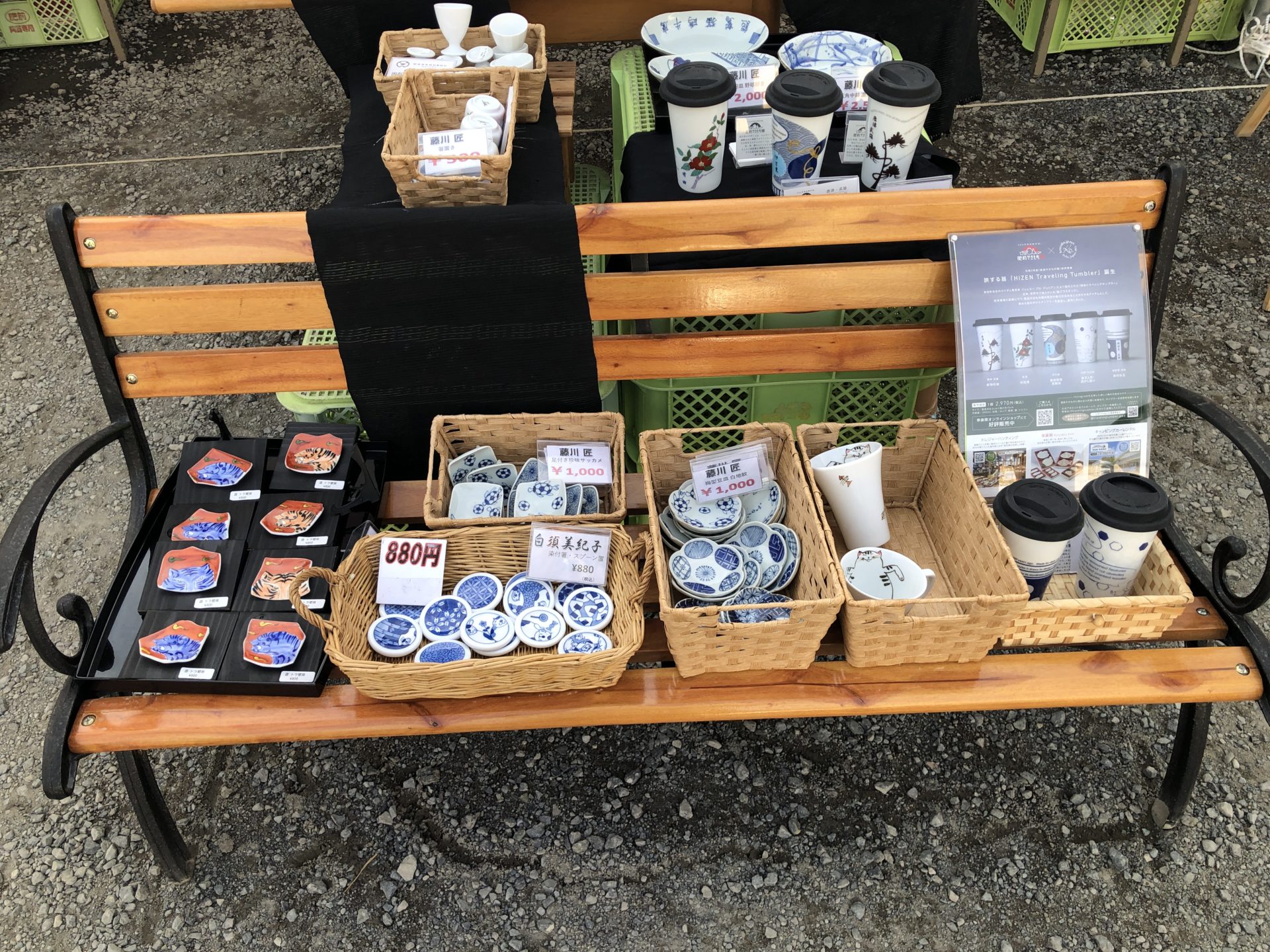 先週までは、ベンチはお客様にくつろいでいただく目的で置いてましたが、あまり利用されていません。それで、小物関係をここにディスプレイしています。